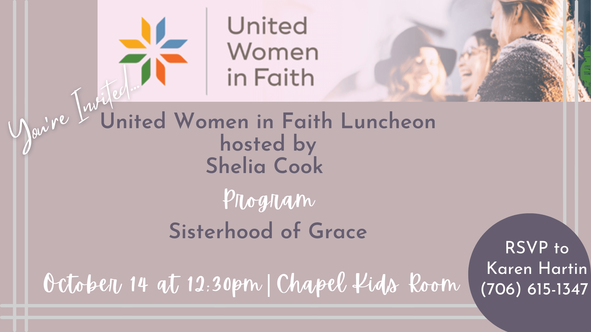 Come join us for our United Women in Faith Luncheon on October 14 at 12:30 pm in the Chapel Kids Room. Shelia Cook will be hosting this event. The program will be on the Sisterhood of Grace. If you would like to attend, please RSVP to Karen Hartin at (706) 615-1347.