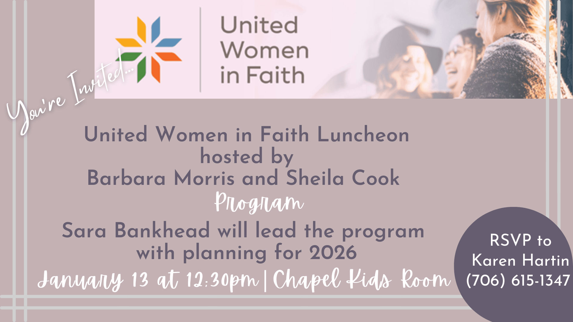 Come join us for our United Women in Faith Luncheon on January 13th at 12:30 pm in the Chapel Kids Room.  Barbara Morris, and Sheila Cook will be hosting this event.  The program will be led by Sara Bankhead on planning for the 2026 calendar year.