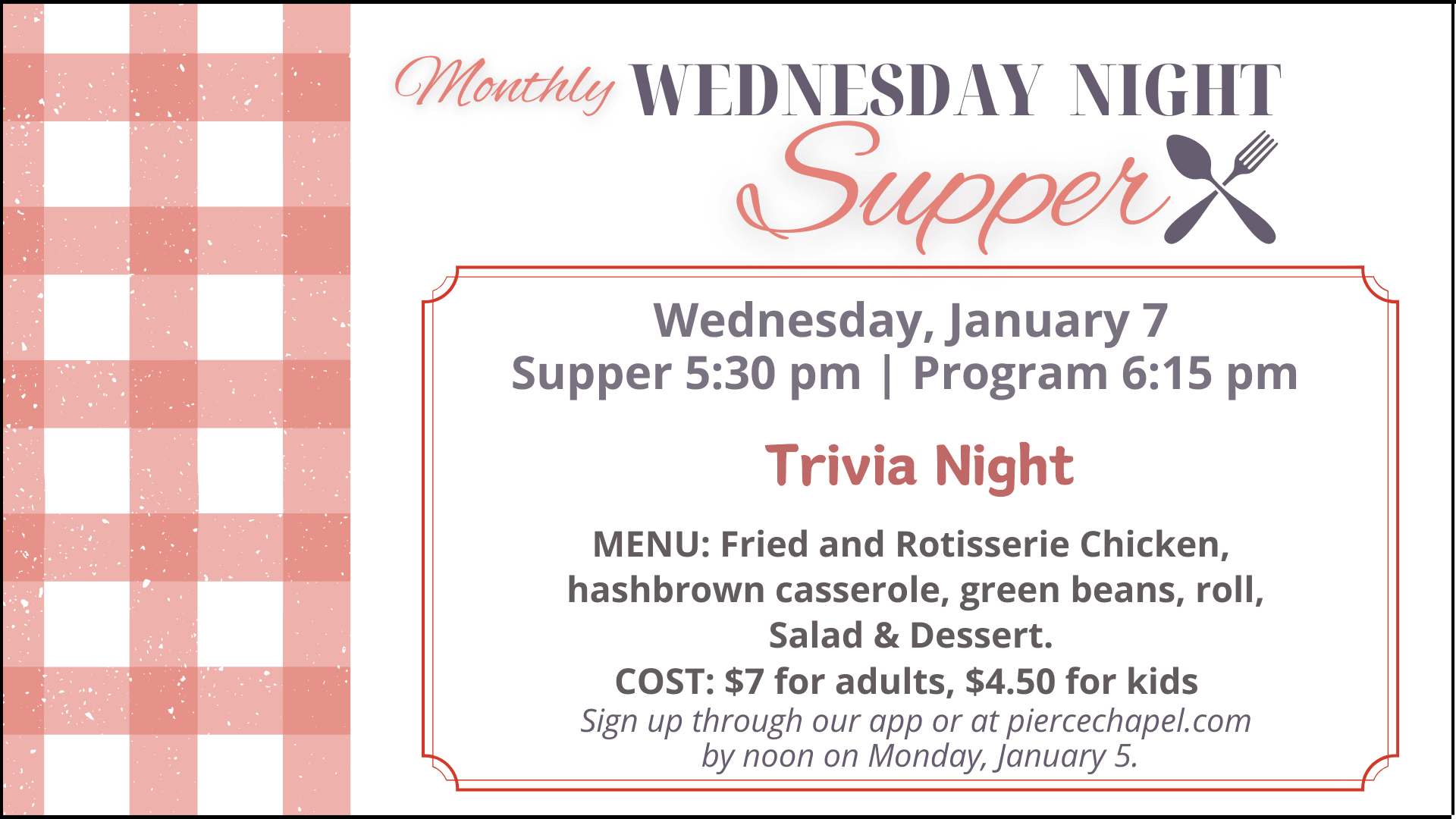 This upcoming month’s Wednesday Night Supper is on Wednesday, January 7! Our program for this evening will be a Trivia Night. We will be serving fried and rotisserie chicken, garlic bread, salad, and dessert. Supper cost is $7.00 for adults, $4.50 for kids ages 5-12, while kids ages 4 and under eat free. Please make your reservation below by January 5!